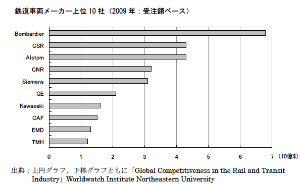 経産省の委託報告書「欧州連合との経済連携促進のための制度分析調査」によると、世界鉄道車両市場のシェアの50%以上は、Alstom(仏)、Siemens(独)、Bombardia(カナダの企業だが、鉄道部門の本社は独のベルリン)の三社によって支配されている。最近では中国の鉄道メーカーの台頭が目覚ましいが、それでも欧州のビッグスリーが常に上位にいることには変わらない。また、同報告書内の最近のデータ(下記グラフ)によると、日本メーカーでは川崎重工だけが上位10社に食い込んでいるが、受注額はALSTOMの半分以下、最上位のBombardiaの4分の1だ。世界市場を支配する欧州鉄道メーカーからすれば、日本市場における海外勢のシェアの低さは、日本の鉄道メーカーの競争力の高さではなく、むしろ、外資に対する市場の閉鎖性の現れと見られている。