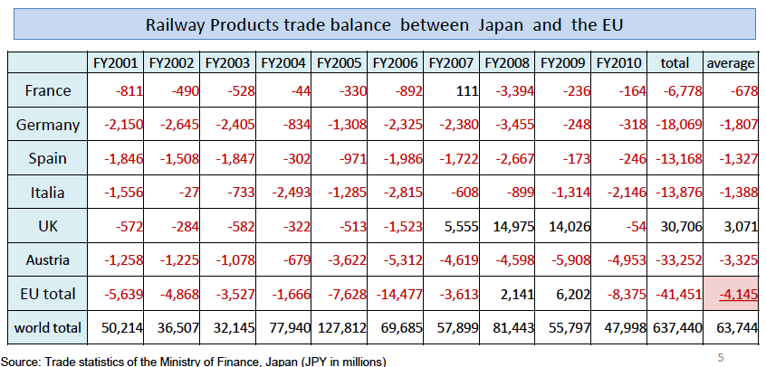 つまり、欧州市場では自国メーカー以外もそれなりにシェアを獲得しているのに対し、日本の鉄道車両市場はほとんど国内メーカーのみで支配されているため、日本の市場は閉鎖的だと論理展開である。こうした批判は直観的に理解できるが、逆に、EUを単一市場と見た場合には、日本の鉄道市場が国内メーカーに支配されているのと同様に、EUの市場も欧州メーカーによって牛耳られていることに変わりはない。さらに、JETROが毎年発表しているレポート「Japan’s Market is Open to the World」によると、鉄道関連の物品(車両・メンテ・電子部品)では、日本はEUに対して貿易赤字を記録している。むしろ、閉鎖されているはずの日本市場へのEUの輸出額の方が大きいのである(※ただし、欧州委員会の鉄道競争力レポートが指摘するように、鉄道関連物品の分類によっては日本のEUへの輸出額の方が大きい場合もある)。